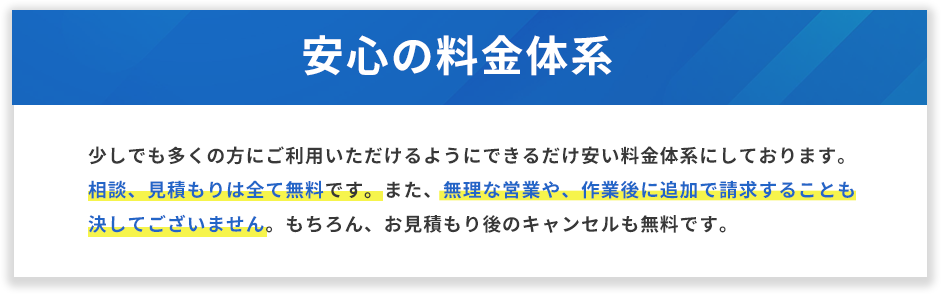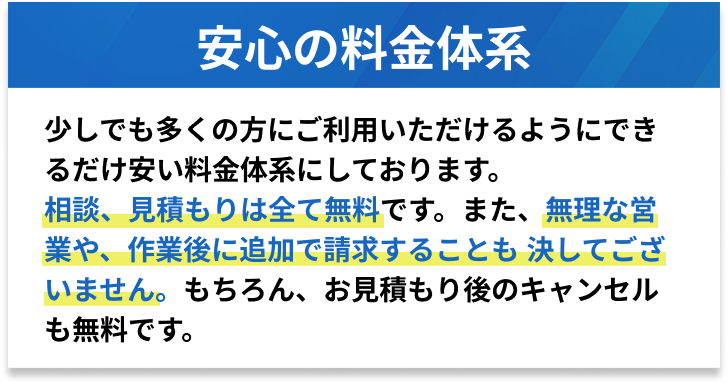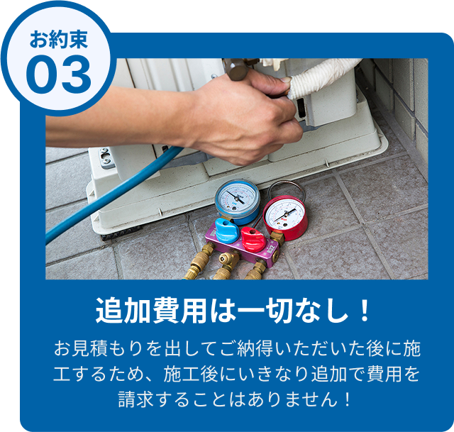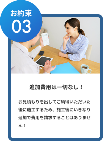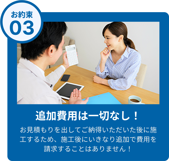 現場調査の内容とお客様のご要望を元に、正式なお見積もりをご提出いたします。見積書提出後に当社に施工依頼をいただけない場合でも、もちろん費用は一切いただきません。